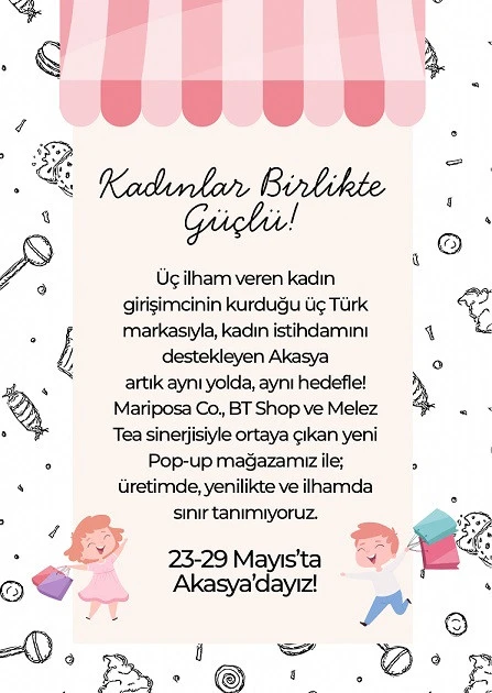 “Kadın girişimciliğini teşvik etmek amacıyla bir araya gelen Ece Sarıoğlu, Buse Terim ve Liliana Aslanoba, kendi markaları ile Akasya’da çok özel bir pop-up mağaza deneyimi yaratıyor. 23 Mayıs’ta kapılarını açacak bu alan, özenle seçilmiş bebek ve çocuk ürünleriyle, stil ve tasarımın öne çıktığı alternatif bir alışveriş deneyimi sunacak.