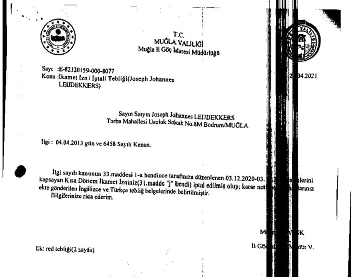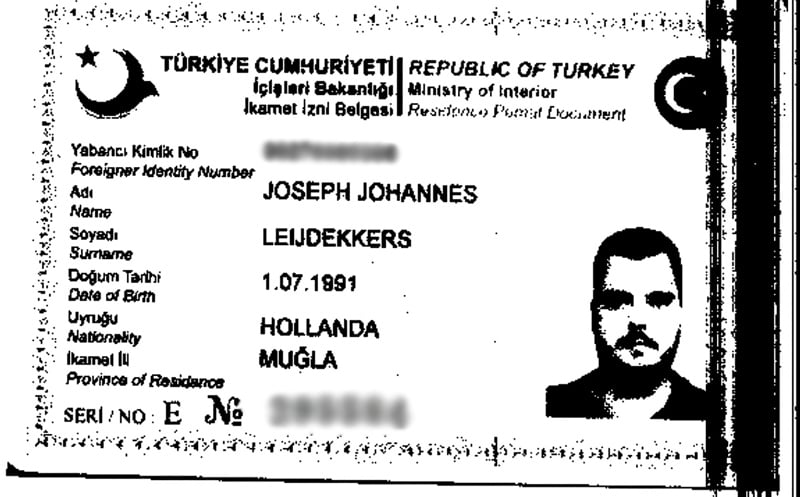 Tombul Jos, kısa dönemli oturum izni için de başvurmuştu. İçişleri Bakanlığı’na bağlı Göç İdaresi Genel Müdürlüğü, 3 Aralık 2020 tarihinde Joseph Johannes Leijdekkers’e geçici ikamet izni kimliğini teslim etti. Henüz Hollanda hakkında Kırmızı Bülten çıkartmamıştı ama ülkesinde uyuşturucu kaçakçılığı yaptığına dair istihbarat kayıtları vardı. İkamet izni kimliği ek klasörlerde bulunuyor.