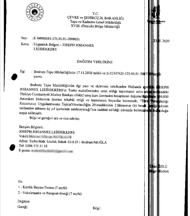 “Türk Vatandaşlığı Kanununun Uygulanmasına İlişkin Yönetmeliğin 20’nci Maddesi kapsamında belirtme tarihinden itibaren üç yıl içerisinde satılmayacağı taahhüdü vardır.” İpuçlarının peşinden gitmeye devam edelim. Davanın ek klasörlerinde yeni bir belge buluyoruz. 23 Kasım 2020 tarihli Çevre ve Şehircilik Bakanlığı Tapu ve Kadastro Genel Müdürlüğü Denizli Bölge Müdürlüğü’nü düzenlediği bir belge var. ‘Vatandaşlığa Uygunluk Belgesi’ olarak sisteme kaydedilmiş. Belgede ucuza, kelepir Türk vatandaşlığının nasıl pazarlandığı gözler önüne seriliyor. Tombul Jos’un vatandaşlık için gerekli olan 250 bin doların üzerinde taşınmaz satın aldığı belirtiliyor. Bodrum’da otel alan Tombul Jos’un vatandaşlık için gerekli şartı sağladığı anlatılıyor.
