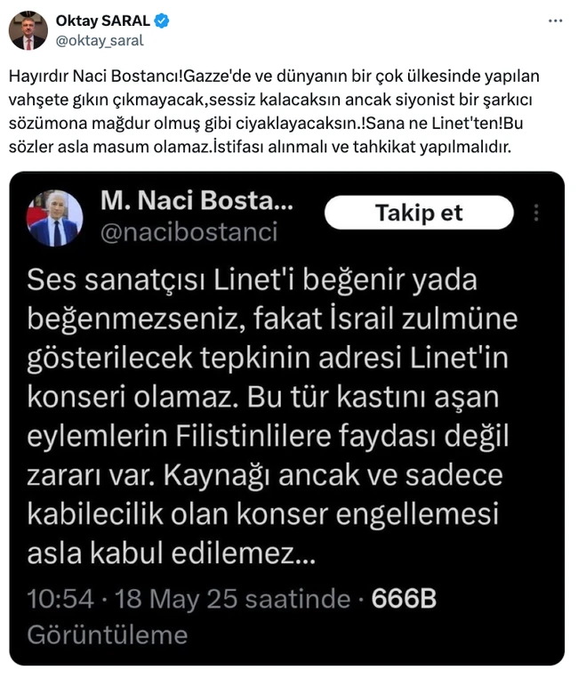 "Hayırdır Naci Bostancı!Gazze'de ve dünyanın bir çok ülkesinde yapılan vahşete gıkın çıkmayacak, sessiz kalacaksın ancak siyonist bir şarkıcı sözüm ona mağdur olmuş gibi ciyaklayacaksın.! Sana ne Linet'ten! Bu sözler asla masum olamaz. İstifası alınmalı ve tahkikat yapılmalıdır."