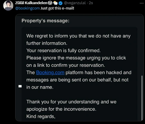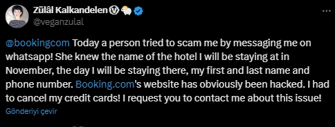 Yurt dışı tatilleri için sıkça kullanılan Booking uygulaması, veri sızıntısıyla gündeme geldi. Cumhuriyet Gazetesi yazarı Zülal Kalkandelen, X hesabından yaptığı paylaşımda, Whatsapp üzerinden kendisine ulaşan bir kişinin kasım ayında kalacağı otelin adı ve gününü söyleyerek kendisini dolandırmaya çalıştığını ifade etti. Bu nedenle kredi kartlarını iptal ettirdiğini belirten Kalkandelen, kurumun kendisiyle iletişime geçmesini istediğini paylaştı. Booking'ten yapılan dönüşü de paylaşan Kalkandelen, aldığı maili "Bu maili aldım" notunu düştü.