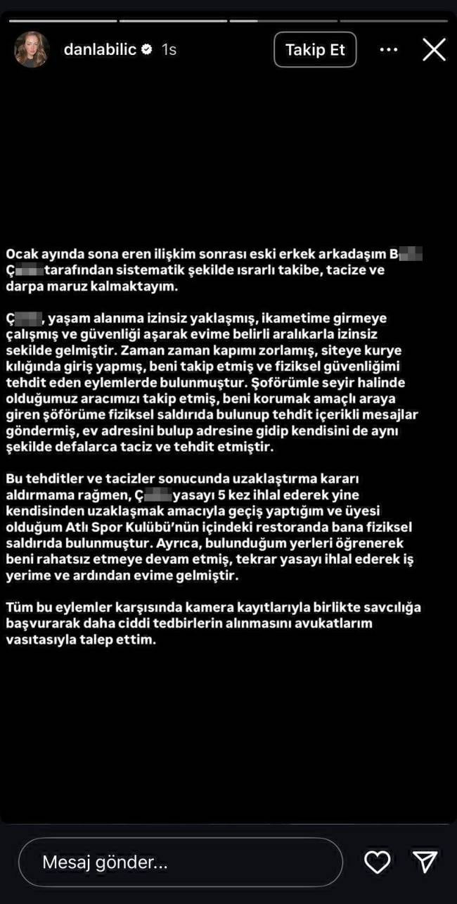 "Ocak ayında sona eren ilişkim sonrası eski erkek arkadaşım B.Ç. tarafından sistematik şekilde ısrarlı takibe, tacize ve darpa maruz kalmaktayım. B.Ç., yaşam alanıma izinsiz yaklaşmış, ikametime girmeye çalışmış ve güvenliği aşarak evime belirli aralıklarla izinsiz şekilde gelmiştir.
