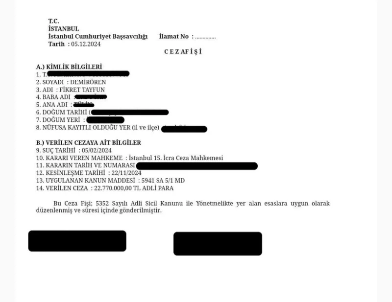 İstanbul 15. İcra Ceza Mahkemesi’nin 2 ayrı kararında Fikret Tayfun Demirören’in karşılıksız çek verdiği iddiasıyla hakkında ceza kararı çıktı. Kesinleşen kararlara göre Fikret Tayfun Demirören, 10 Ocak 2024’te 43 milyon 700 bin TL’lik karşılıksız çek kullandı.