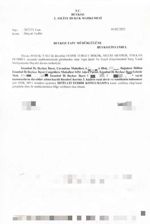 Başak Yalı'nın avukatı Özgür Ozan Bulut 2. Asliye Hukuk Mahkemesi'ne başvurarak Volkan Demirel'in oturduğu villanın satışına engel olmak için tedbir kararı koydu.