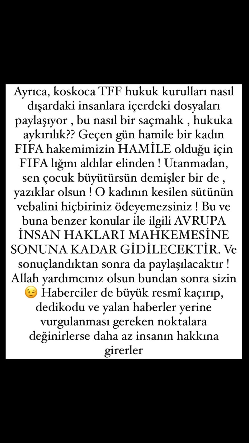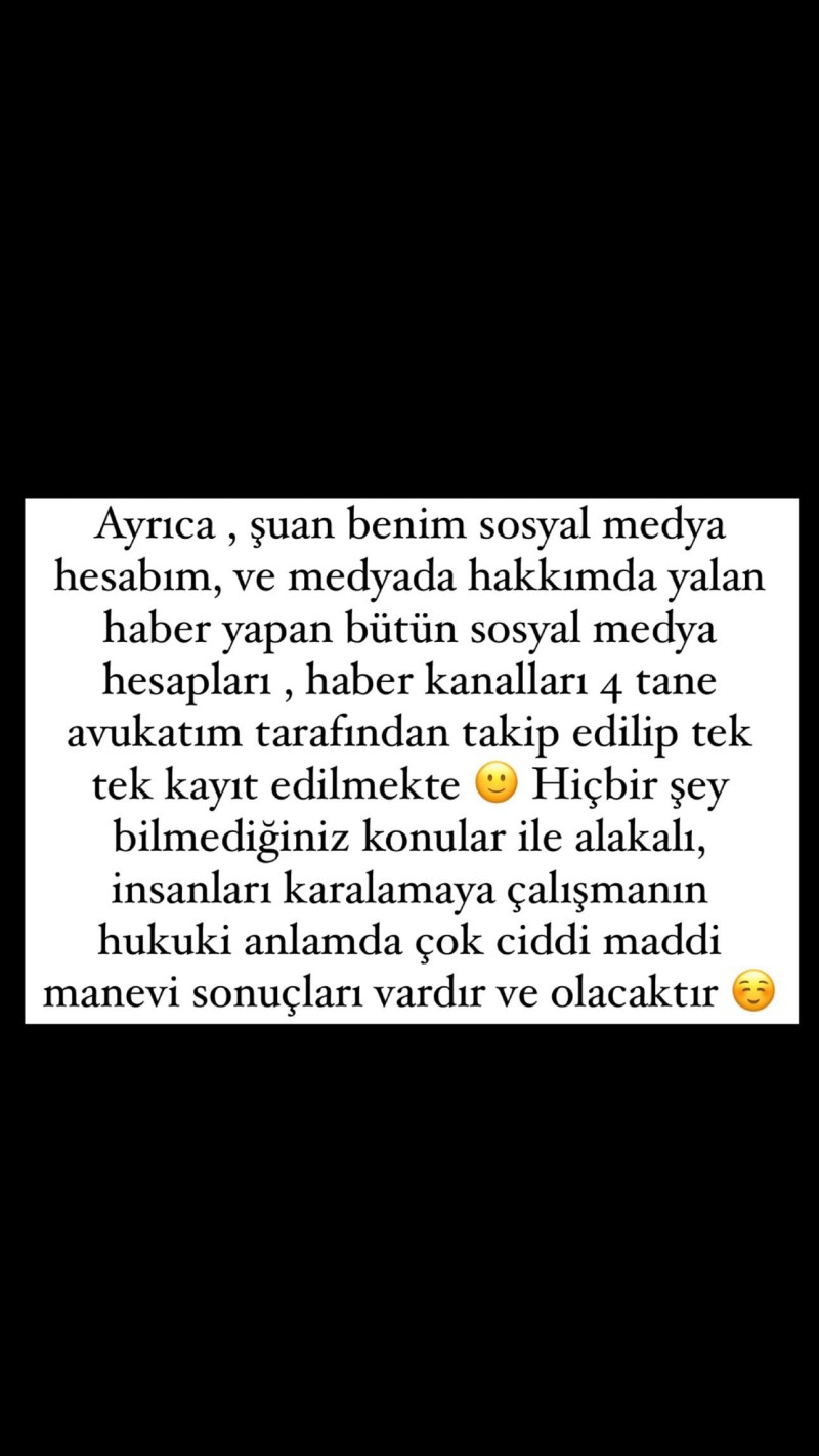 Ayrıca, şuan benim sosyal medya hesabım, ve medyada hakkımda yalan haber yapan bütün sosyal medya hesapları, haber kanalları 4 tane avukatım tarafından takip edilip tek tek kayıt edilmekte Hiçbir şey bilmediğiniz konular ile alakalı, insanları karalamaya çalışmanın hukuki anlamda çok ciddi maddi manevi sonuçları vardır ve olacaktır.”
