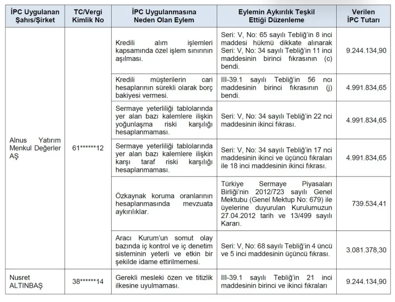 SPK, Nusret Altınbaş'a gerekli mesleki özen ve titizlik ilkesine uyulmaması nedeniyle ceza verdi.