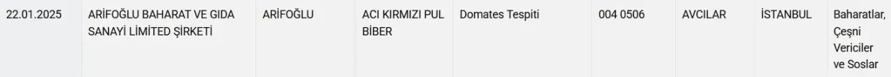 Arifoğlu Baharat ve Gıda Sanayi Ltd. şirketinin ürettiği pul biberde de domates tespit edildi.