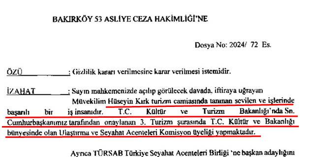 Dava açıldıktan sonra, 13 Mayıs 2024 tarihinde Bakırköy 53. Asliye Hakimliğine başvuran Hüseyin Kırk, 1-3 Kasım 2017 tarihlerinde Ankara’da 1500’ü aşkın turizmcinin katılımıyla gerçekleşen 3. Turizm Şurası’nın 13 komisyonundaki 333 üyeden biri olduğunu ileri sürerek, davada gizlilik kararı aldırmak istedi. 3 gün süren organizasyondaki geçici görevinin arkasına sığınıp, dilekçesinde Cumhurbaşkanı ve Kültür Turizm Bakanlığı’nın ismini de geçirerek “saygın ve sevilen bir turizmciyim” diyerek mahkemeyi etkilemeye çalışan Hüseyin Kırk’ın talebi reddedildi.