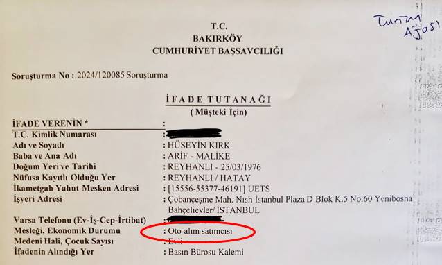 Hakkında çıkan haberlerle ilgili olarak Bakırköy Cumhuriyet Başsavcılığı’na soruşturma istemiyle başvuruda bulunan Hüseyin Kırk’ın dilekçesindeki meslek bölümüne “oto alım satım” yazdırdığı görüldü.