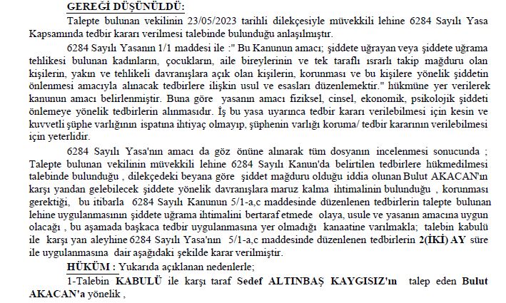 Oahaber.com'un haberine göre mücevherat, finans, lojistik ve enerji alanlarında yatırımları bulunan Altınbaş Holding sahibi Vakkas Altınbaş'ın kızı Sedef Altınbaş Kaygısız’a eski eşi ünlü iş adamı Bulut Akacan’a hakaret ve iftiraları nedeniyle İstanbul 1. Aile Mahkemesi tarafından 2 ay hakaret etmeme ve uzaklaştırma kararı verildi.